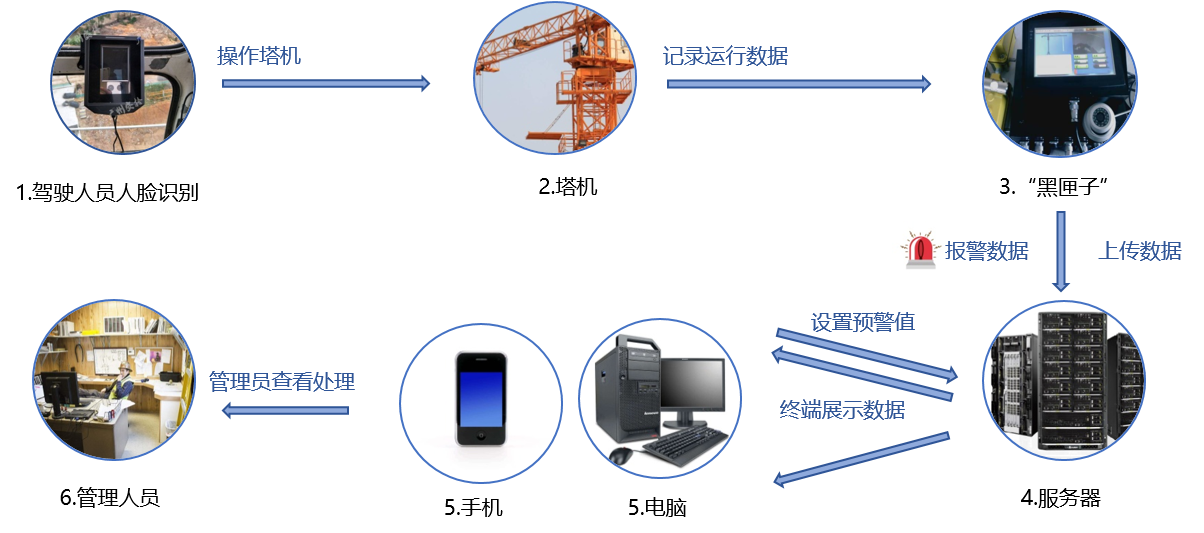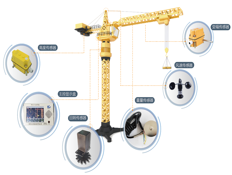塔式起重設備安全監(jiān)控管理系統(tǒng),包含設備主機、顯示系統(tǒng)、風速傳感器、高度傳感器、變幅傳感器、重量傳感器、轉(zhuǎn)角傳感器、防傾斜傳感器等組成。
